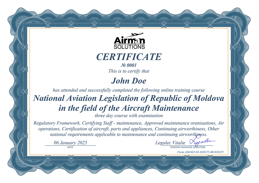 Курс «Национальное авиационное законодательство Республики Молдова в области технического обслуживания воздушных судов» направлен на приобретение конкретных профессиональных навыков, необходимых персоналу организаций по техническому обслуживанию, поддержанию летной годности, проектированию и производству воздушных судов и их компонентов, и определяется следующим образом: